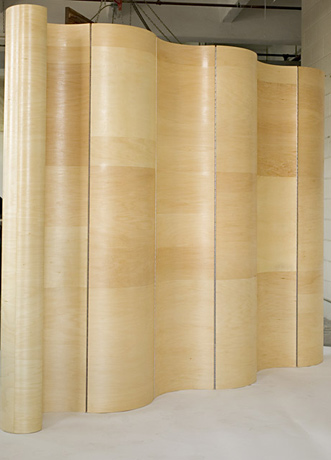 This folding wall is 9.5' long and 7' high. Installed on gliders, it folds completely into a 2' by 2' closet and serves as an expandable architectural partition/room divider for a Manhattan apartment.