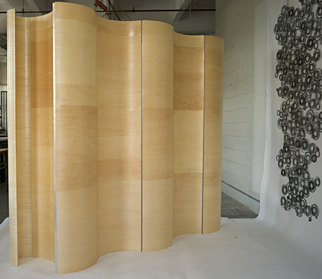 This folding wall is 9.5' long and 7' high. Installed on gliders, it folds completely into a 2' by 2' closet and serves as an expandable architectural partition/room divider for a Manhattan apartment.