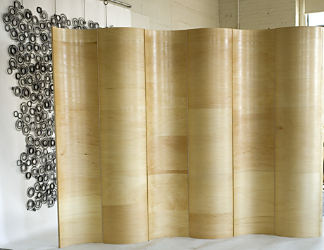 This folding wall is 9.5' long and 7' high. Installed on gliders, it folds completely into a 2' by 2' closet and serves as an expandable architectural partition/room divider for a Manhattan apartment.