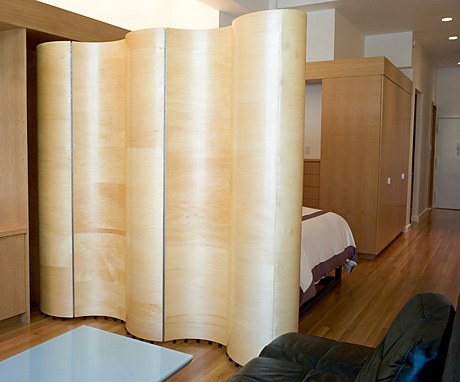This folding wall is 9.5' long and 7' high. Installed on gliders, it folds completely into a 2' by 2' closet and serves as an expandable architectural partition/room divider.