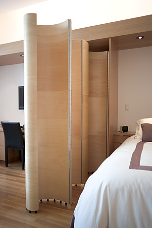 This folding wall is 9.5' long and 7' high. Installed on gliders, it folds completely into a 2' by 2' closet and serves as an expandable architectural partition/room divider.