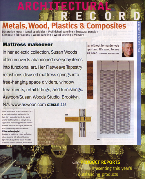 "In her eclectic collection, Susan Woods often converts abandoned everyday items into functional art. Her Flatwave Tapestry refashions disused mattress springs into free-hanging space dividers, window treatments, retail fittings, and furnishings... "