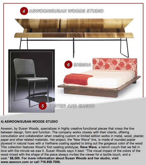 "...The company works closely with their clients, offering consultation and collaboration when creating custom or limited edition works in metal, wood, plaster, paper and other related materials. Her project, the “New Wave” line, is made of rounded poplar plywood in natural hues with a Verthane coating applied to bring out the gorgeous color of the wood. This collection features Wood’s first seating prototype, Rave Wave, a bench couch that we fell in love with the minute we saw it. Susan Woods says it best: “The visual impact of the colors of the wood mixed with the shape of the piece always invites the viewer for a tactile touch, and a seat.” $8,500. For more information about Susan Woods and her studio, visit www.aswoon.com or call 718.858.7006."