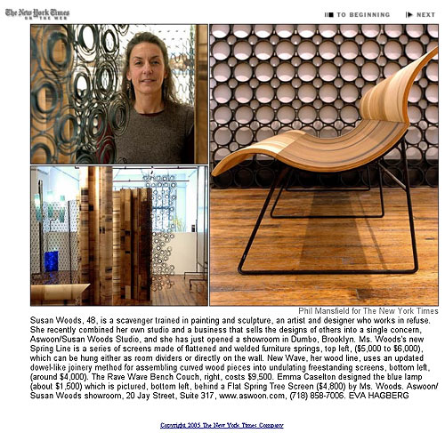 "Susan Woods, 48, is a scavenger trained in painting and sculpture, an artist and designer who works in refuse. She recently combined her own studio and a business that sells the designs of others into a single concern, Aswoon®/Susan Woods Studio, and she has just opened a showroom in Dumbo, Brooklyn."